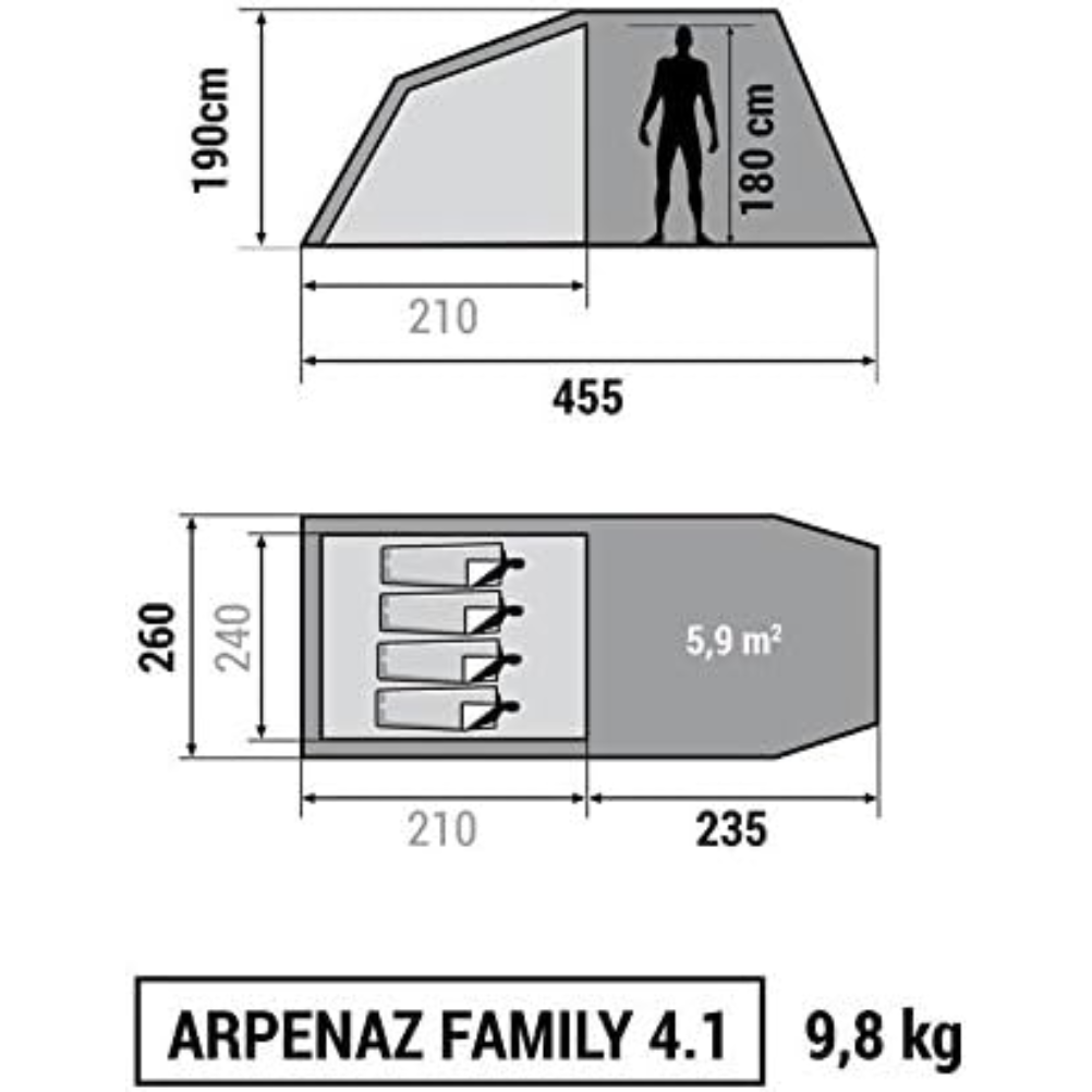 La Quechua Arpenaz 4.1 F&B es una tienda de campaña con estructura de varillas, capacidad para 4 personas y 1 dormitorio. El dormitorio mide 210 x 240 cm. La zona de estancia tiene una superficie de 5 m² y una altura máxima de 1,90 m. El conjunto utiliza tejido Fresh & Black en el doble techo y en el dormitorio. La estructura se monta con varillas de fibra de vidrio e incluye piquetas y vientos. El doble techo está fabricado en poliéster con revestimiento de poliuretano y costuras selladas; el suelo está fabricado en polietileno. La impermeabilidad del doble techo se indica en 2.000 mm Schmerber. La tienda cuenta con puerta con cremallera, ventilaciones y suelo tipo cubeta en la zona de estancia. El formato plegado mide 65 x 26 x 26 cm y el peso es de 10,2 kg. La estructura ha sido ensayada en túnel de viento y plataforma giratoria a 50 km/h.