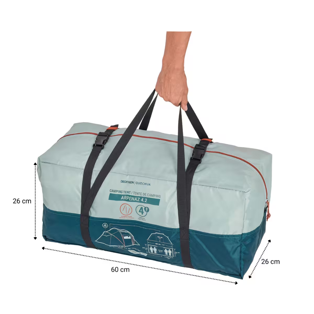 La Tienda de Campaña Quechua Arpenaz 4.2 4 Personas es una tienda con capacidad nominal para 4 personas y configuración interior de 2 habitaciones independientes más una estancia central. La estructura utiliza varillas y un doble techo exterior; los dormitorios quedan instalados bajo esa cubierta. El tejido del doble techo es de poliéster y el suelo está fabricado en polietileno. El acceso se realiza mediante una puerta principal con cierre de cremallera. La tienda incorpora puntos de ventilación y zonas de malla en el conjunto interior. El montaje se completa con piquetas y vientos de fijación al terreno. La denominación 4.2 de la gama Arpenaz identifica una distribución con 4 plazas y 2 dormitorios. El formato corresponde a una tienda desmontable de camping con compartimentos separados para descanso y una zona común bajo cubierta.